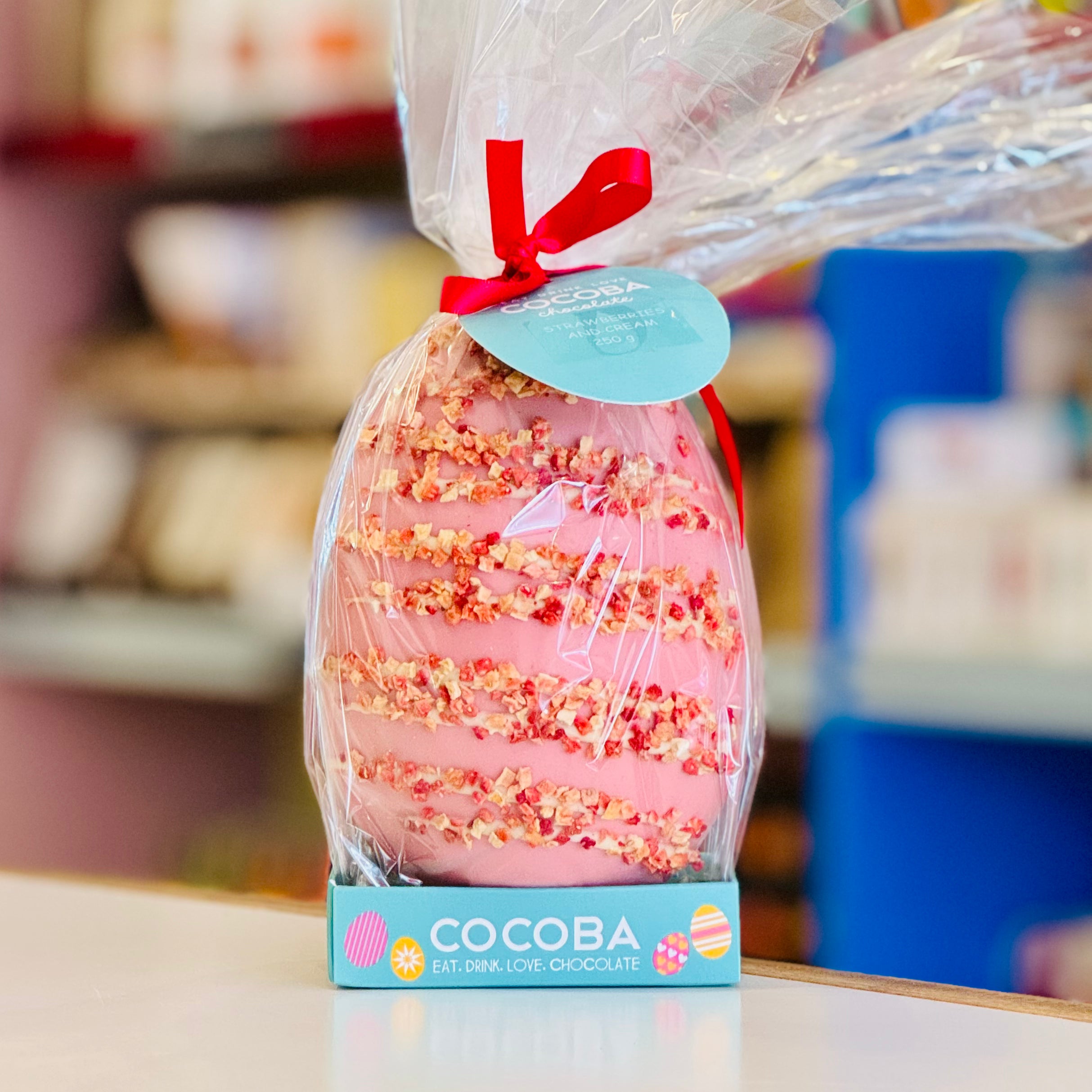 A rich and vibrant white chocolate Easter egg, infused with real strawberries. Adorned with a drizzle of white chocolate, and pieces of freeze-dried strawberries for an extra zing!
