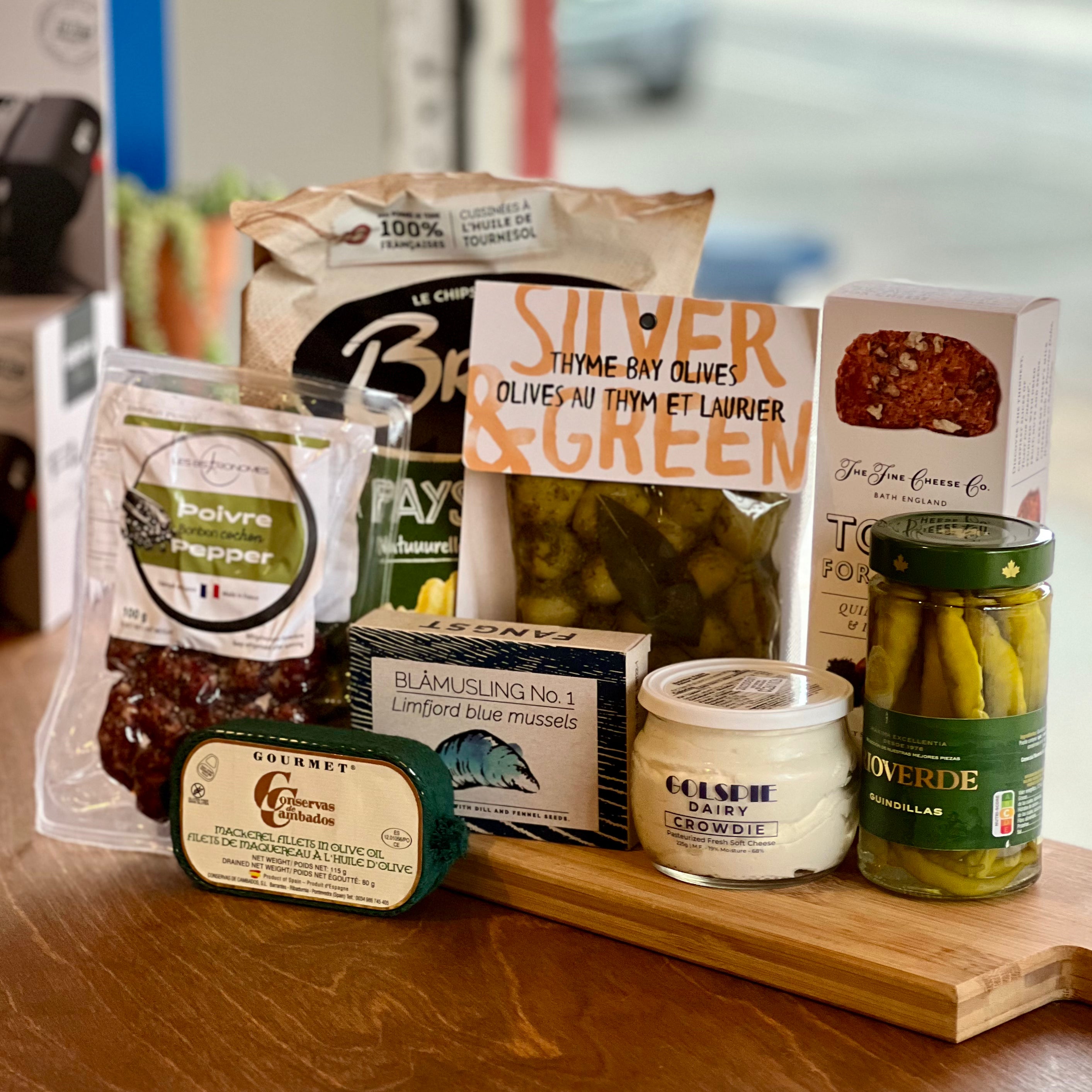 This sensational bundle sets you up with everything you need for an A+ snacking board. A selection of conservas anchors the collection and is accompanied by La Beurasse (a fresh goats cheese), Spanish cured meat, olives, guindilla peppers, chips, crackers--the works!