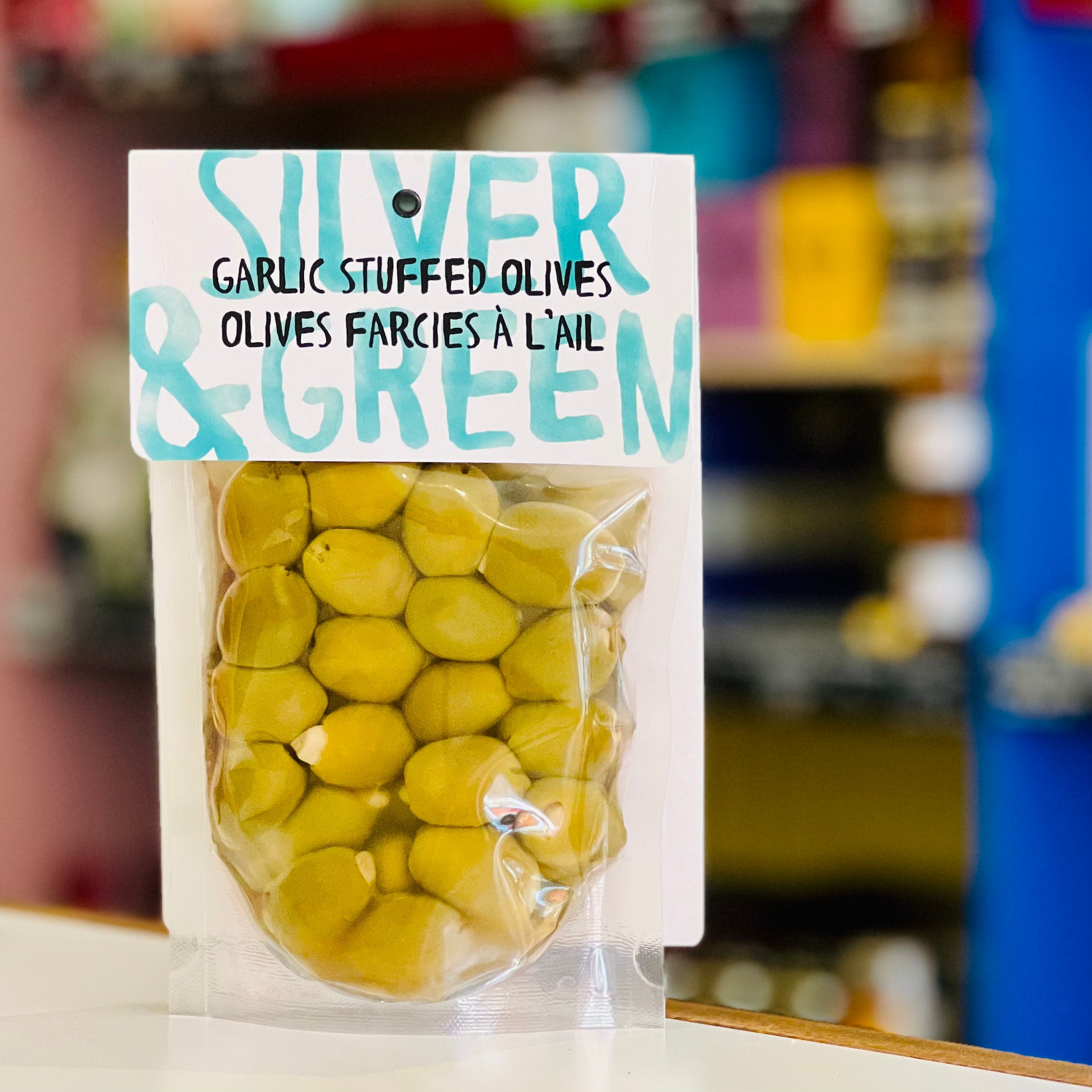 Pitted green Halkidiki olives stuffed with a whole garlic clove preserved in a blend of sunflower oil and extra virgin olive oil.