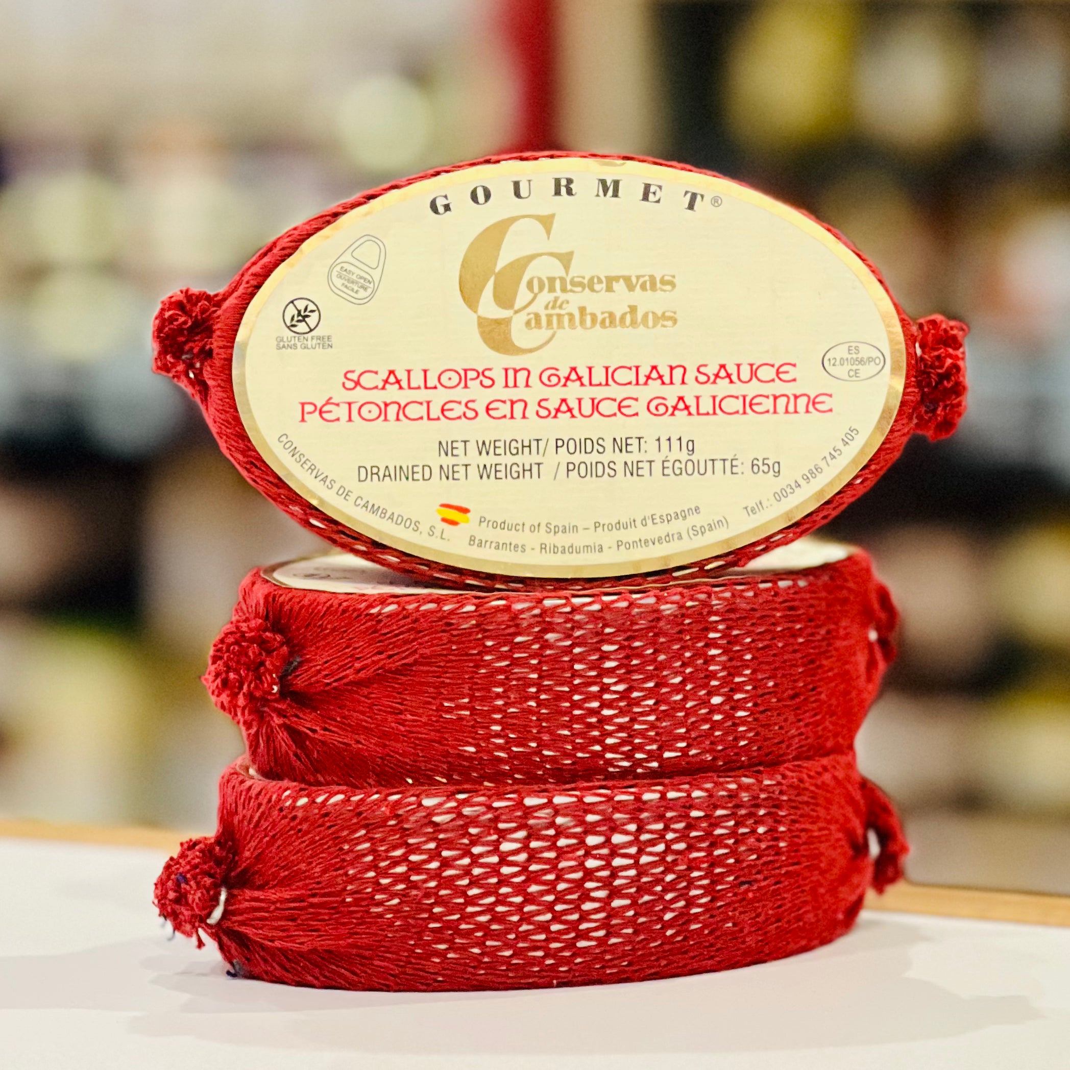 The scallops from the Galician Rias. They are cleaned one by one and then canned in a savoury Galician sauce.