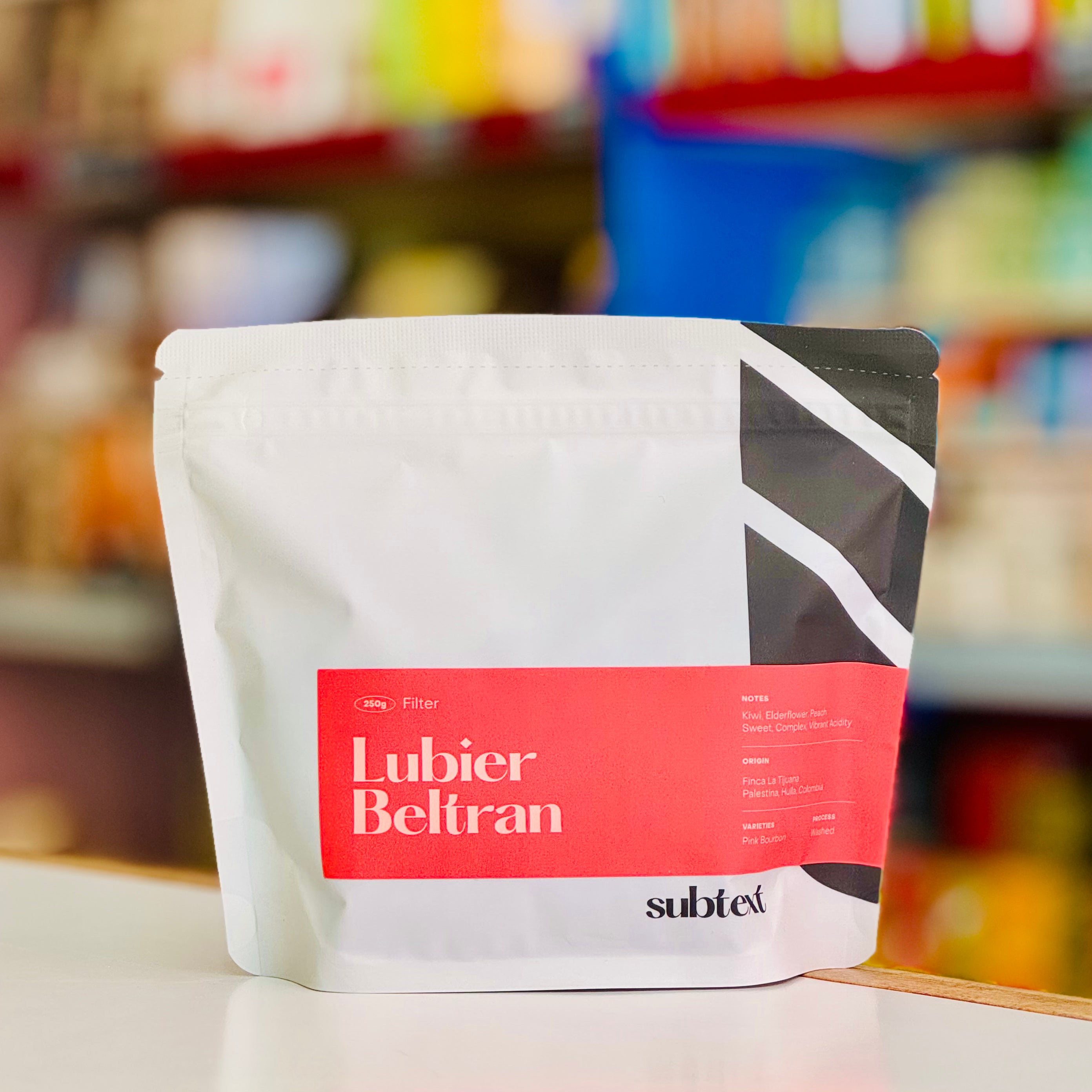 This coffee comes from Lubier Beltran's 5 hectare farm in Colombia. Expect notes of Kiwi, elberflower & peach. It's complex with a vibrant acidity.