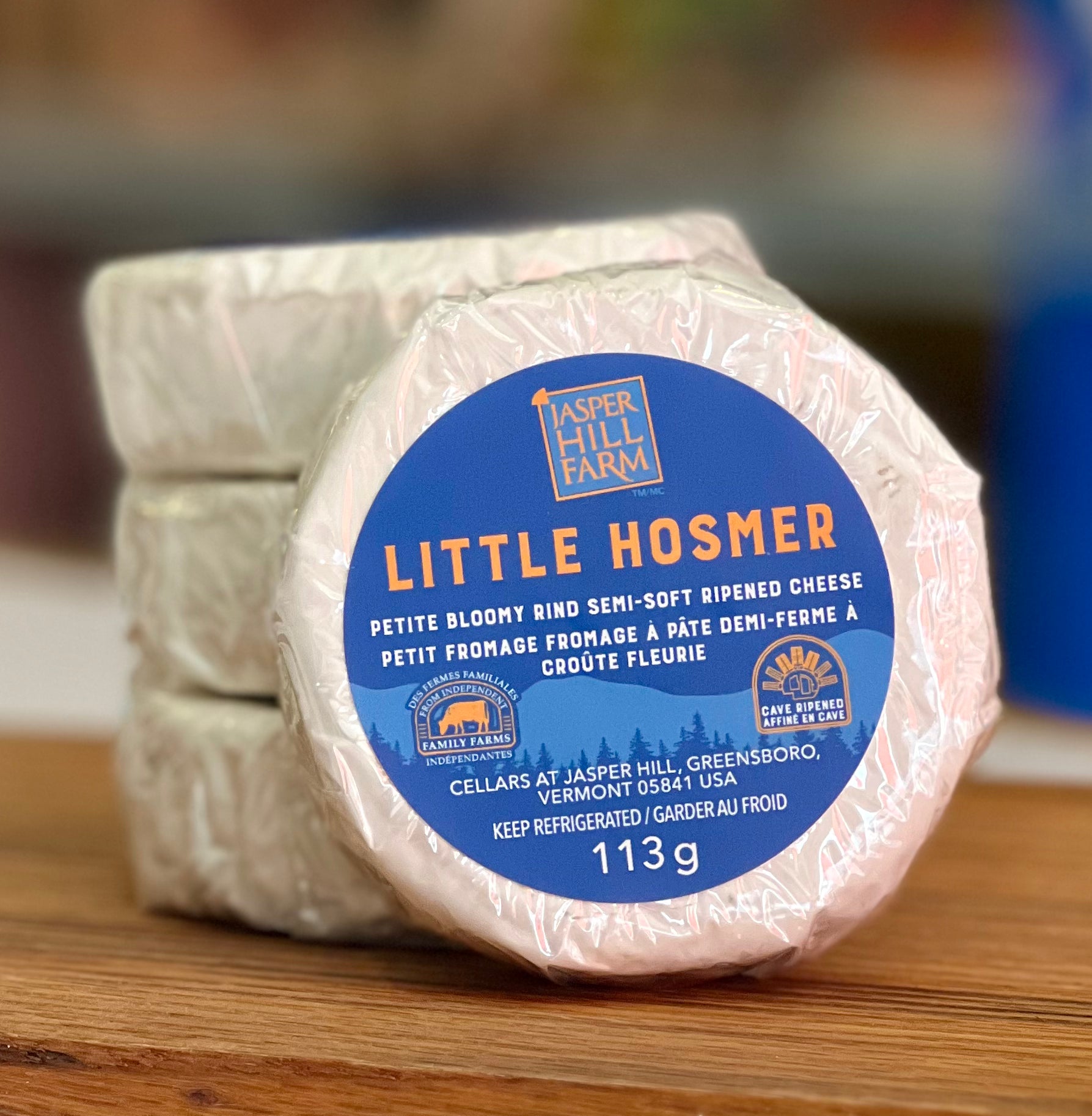 From the Cheesemaker: "[A] mini version of a new world-style brie. This cheese is named for a small pond in nearby Craftsbury, Vermont. Little Hosmer is an approachable and nuanced soft ripened cheese. Beneath its thin, bloomy-rind lies a gooey, milky core showing a complex array of flavors at peak ripeness: cauliflower, crème fraiche, and toasted nuts. A bright, clean finish with a hint of white mushroom aroma follows the rich flavors of the paste."