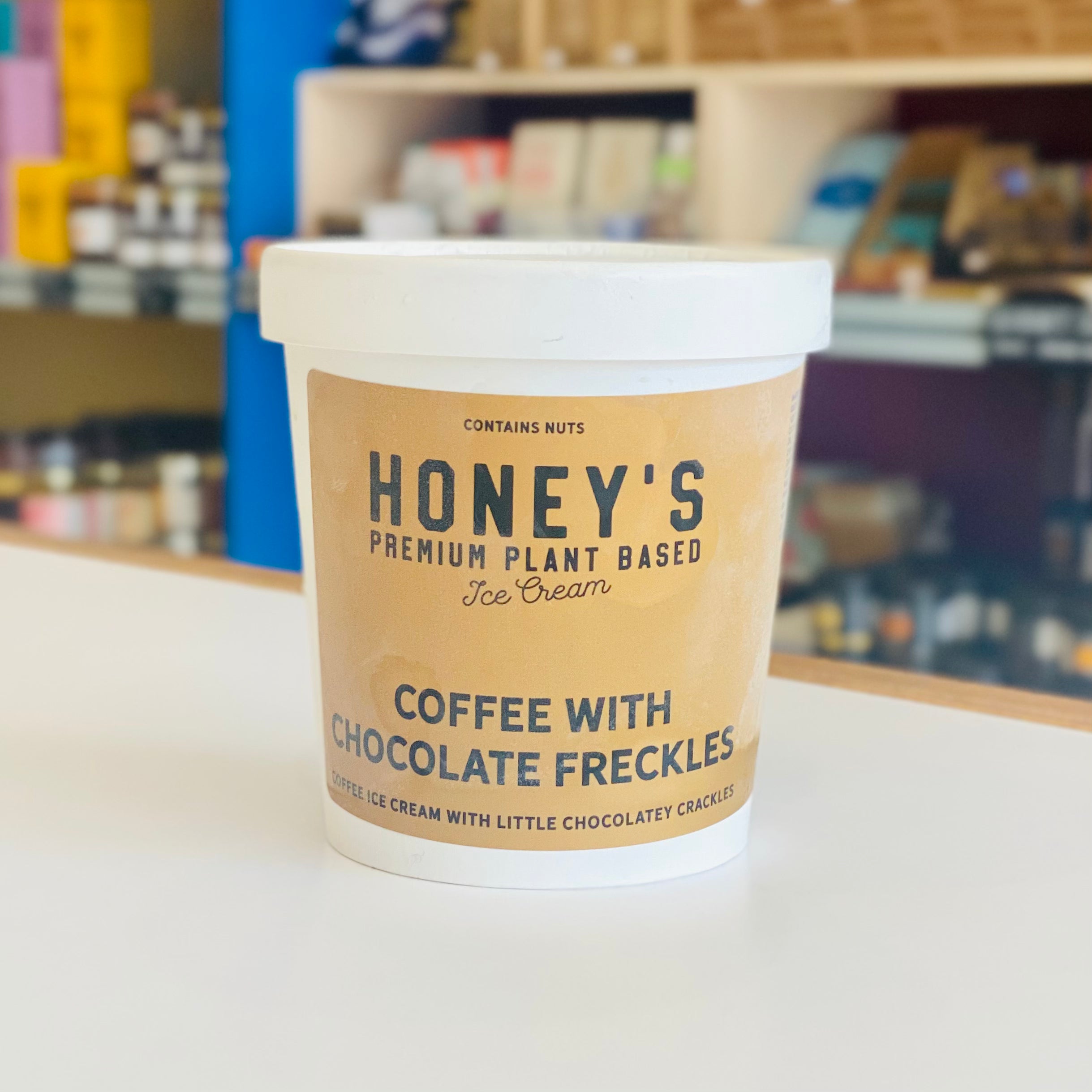 Coffee ice cream pepped up with a little dash of cocoa for depth. The chocolate freckles are created when chocolate sauce is drizzled into the cold ice cream, hardening it instantly. Chocolate crackle paradise.