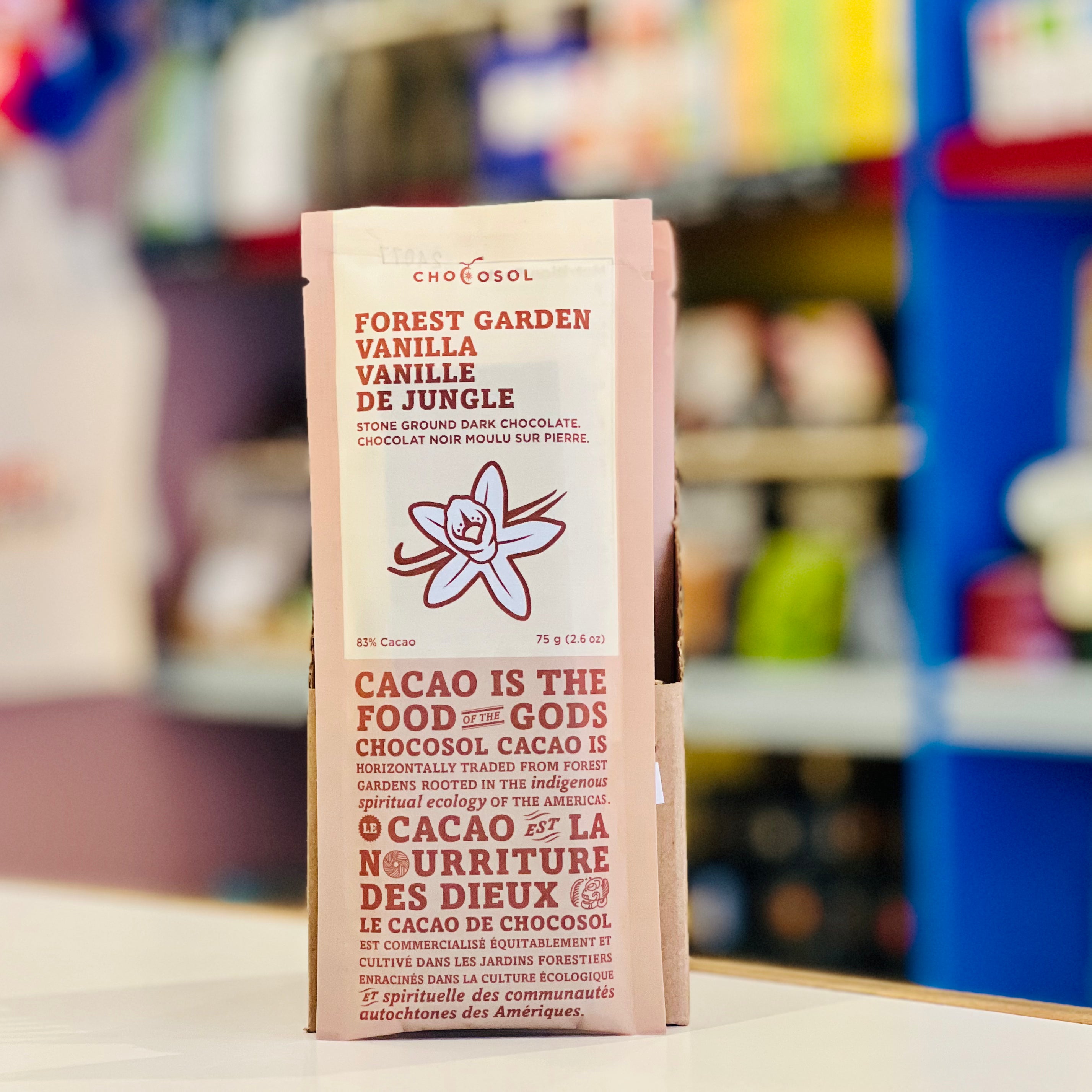 Whole vanilla pods are ground directly into 83% dark chocolate for a surprisingly mellow, naturally sweet darket. Each bar is finished with a generous sprinkle of cacao nibs for a satisfying crunch.