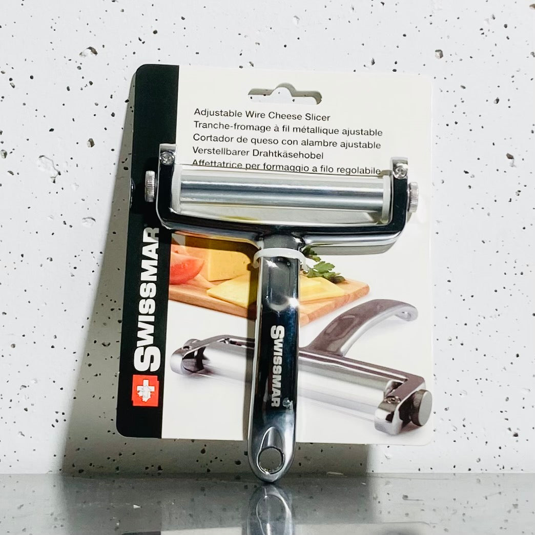 Adjustable wire cheese slicer. Cuts even slices of medium and hard cheeses, simply adjust the roller to the desired thickness. Ideal for raclette. Delivers amazing precision slice after slice. Stainless steel, dishwasher safe.