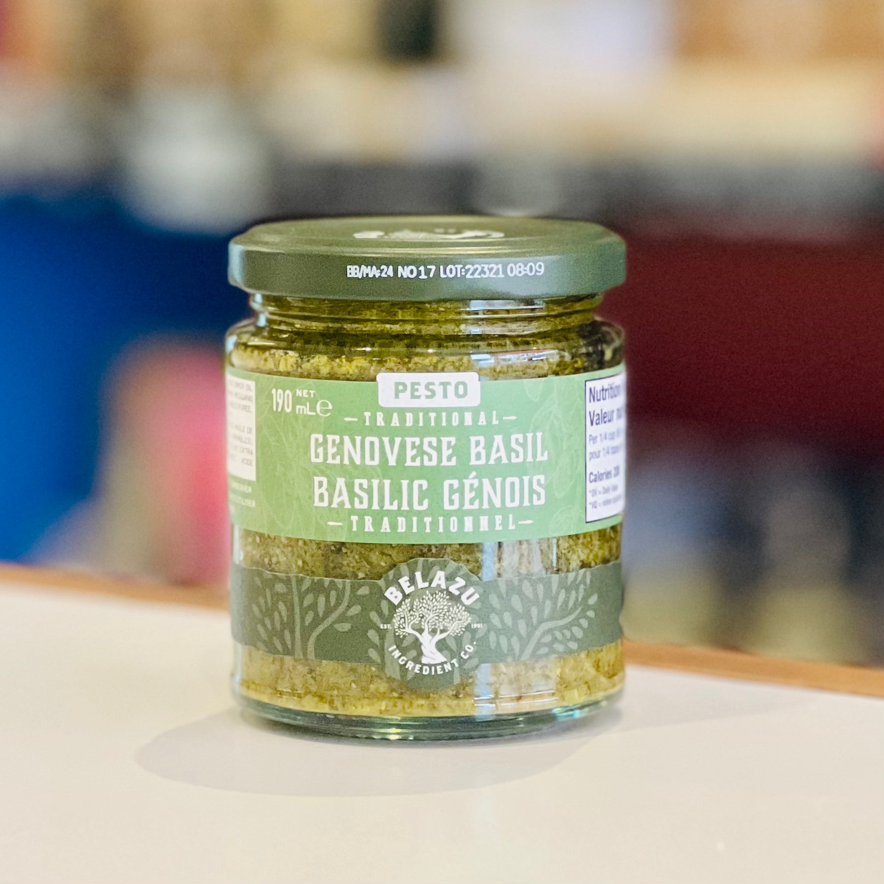 Ingredients: Basil (45%), Sunflower Oil, Parmigiano Reggiano Cheese (MILK) (11%), Pine Kernels (3%), Extra Virgin Olive Oil (2%), Salt, Garlic Puree, Acidity Regulator: Cirtic Acid.