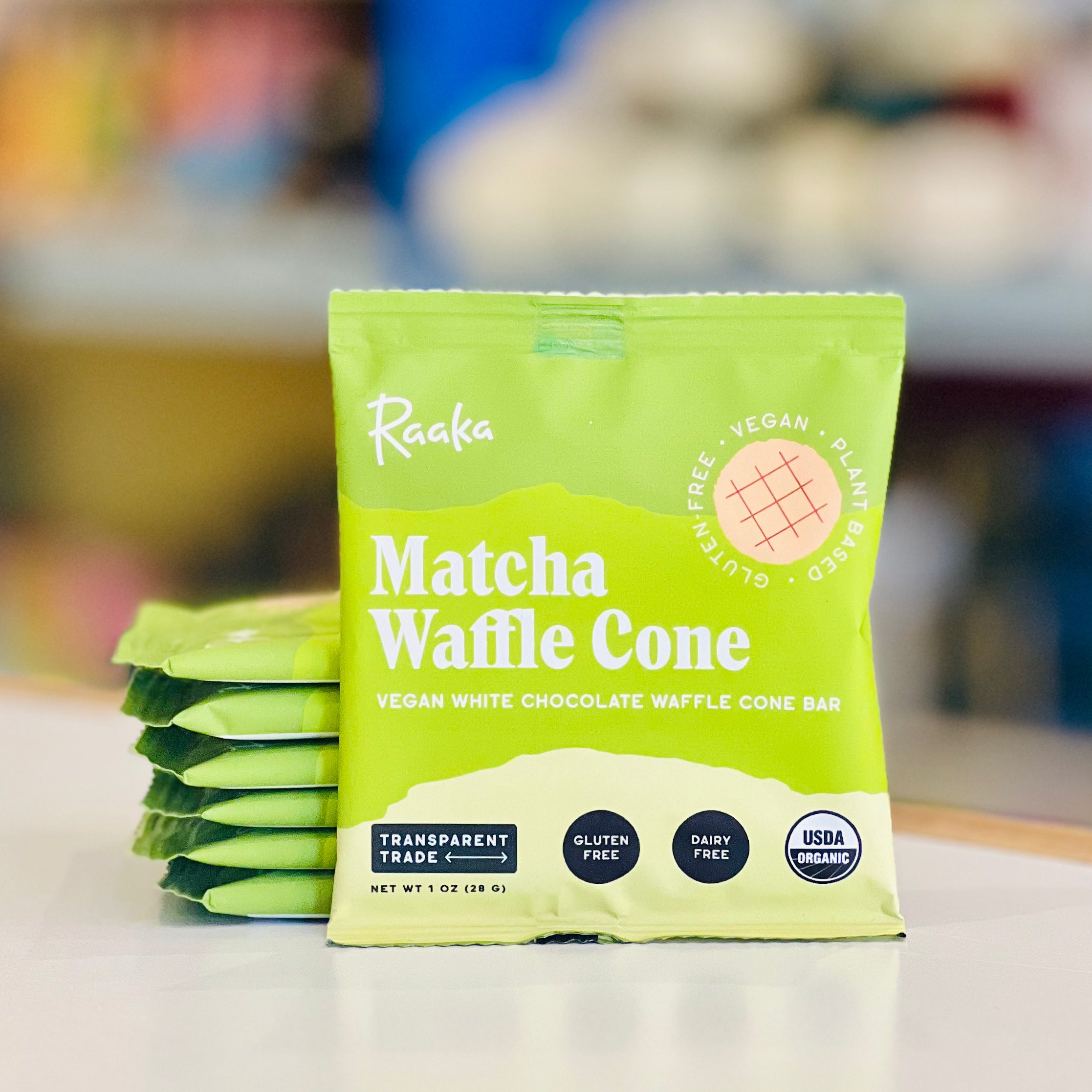 A crisp gluten-free waffle cone cookie set in Raaka's vegan matcha white chocolate. Tastes like the crunchy end of matcha ice cream packed in a cone.