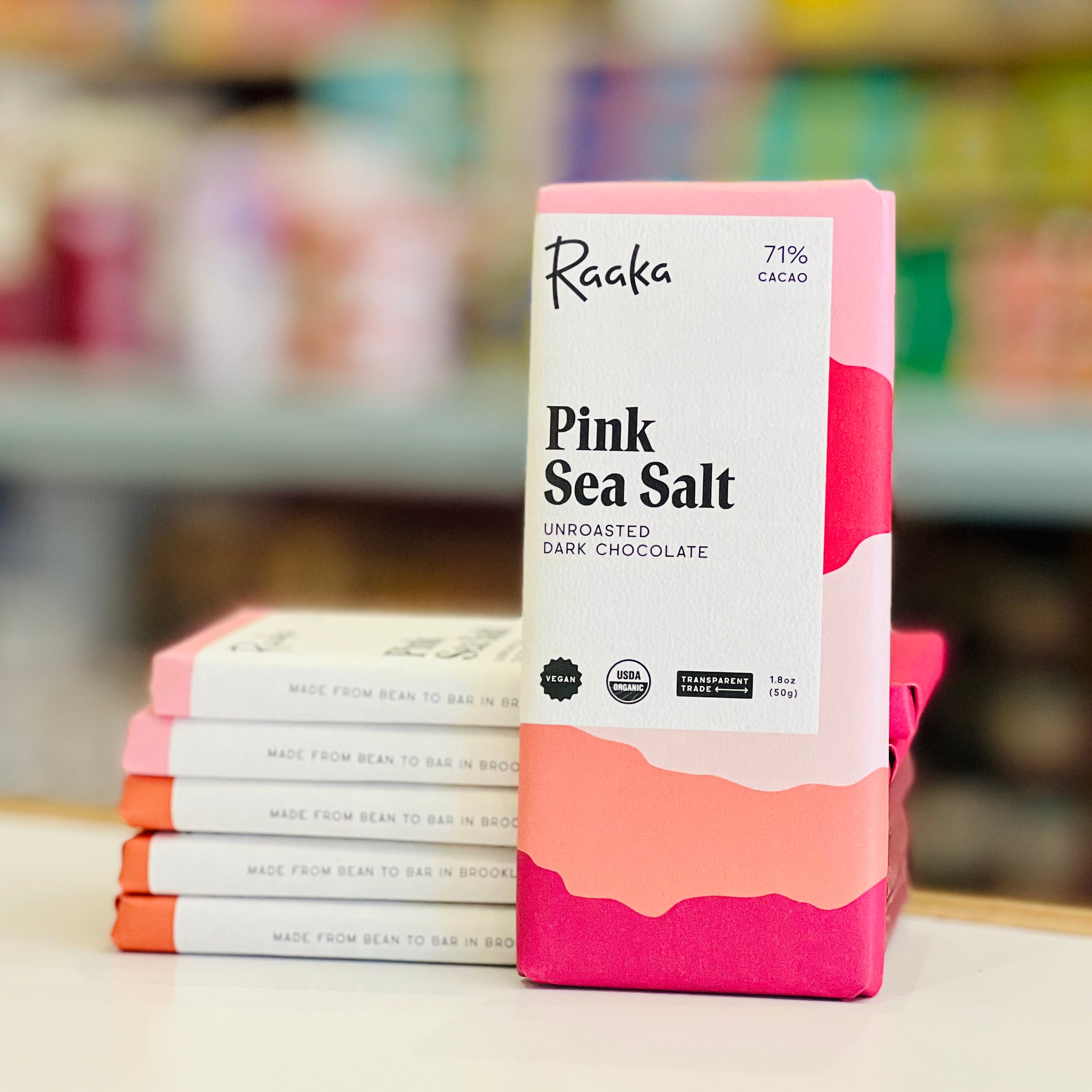 Made with single origin cacao from Zorzal Cacao, a farm and fermentary within a bird sanctuary in the Dominican Republic, and sprinkled with Peruvian pink salt sourced from Salt of the Earth Co. A fruity, complex salted dark chocolate to end all salted dark chocolates.