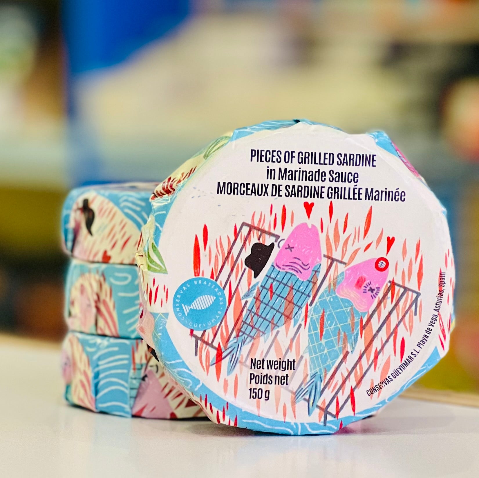 Arbequina de Castillo de Canena Extra Virgin Olive Oil is used to marinate the large sardines, which are roasted with holm oak wood before being canned with apple cider vinegar and aromatic spices